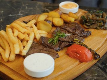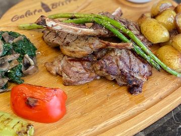 Grilled patties made with minced lamb and New York strip, served over fresh bread, topped with tomato sauce, melted butter, and creamy yogurt.