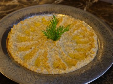 Smoked eggplant blended with tahini and strained yogurt. A creamy, smoky dip.