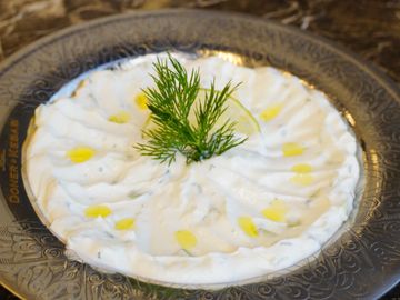 Strained yogurt with finely chopped cucumber and fresh mint.