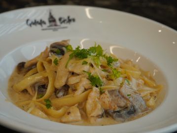 Sliced grilled chicken tossed with fettuccine pasta in a rich Alfredo sauce made with cream, Parmesan cheese, and butter.
