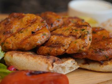 Minced chicken seasoned with red pepper and Mediterranean spices, grilled and served with roasted tomatoes, pepper, and white rice.