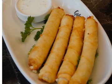 Crispy phyllo rolls stuffed with feta cheese and herbs. Served with arugula and creamy white sauce.