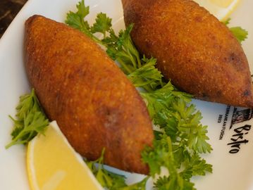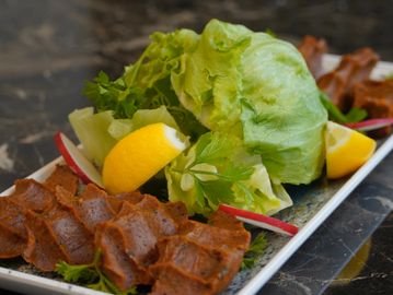 Crispy fried bulgur stuffed with seasoned ground beef, walnuts, and pine nuts. Served with parsley and lemon.