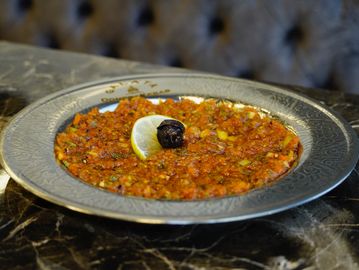 Spiced bulgur mixed with pepper paste, tomatoes, pomegranate molasses, and olive oil.