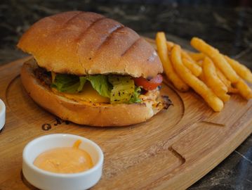 Grilled beef patty topped with lettuce, tomatoes, pickles, caramelized onions, and house white sauce. Served with French fries.
