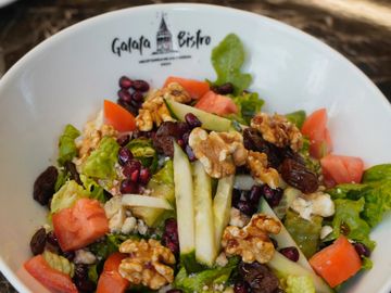 Mixed Mediterranean greens with creamy goat cheese, sweet raisins, cherry tomatoes, and crisp cucumber. Drizzled with pomegranate molasses and extra virgin olive oil