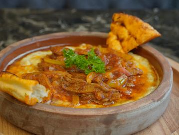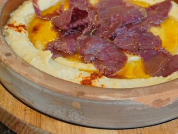 Creamy mashed chickpeas blended with tahini, fresh lemon juice, and extra virgin olive oil. Topped with thin slices of savory pastrami.