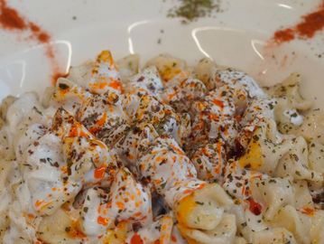 Traditional handmade dumplings filled with seasoned ground beef. Topped with garlic yogurt, warm tomato sauce, mint, and burnt butter.