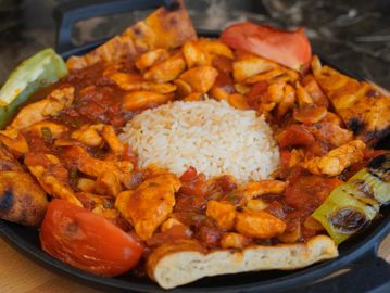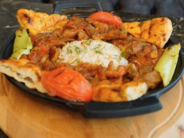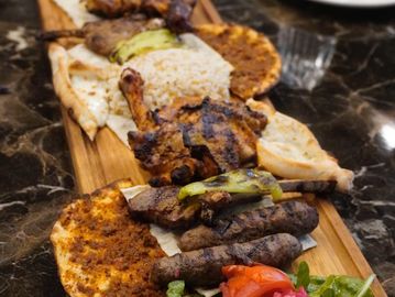 2 pieces Lamb chops, 2 pieces chicken chops, 2 pieces uskub kofte, 2 pieces butcher kofte and lahmacun comes side rice and roasted tomatoes and bell peppers