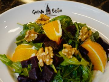 Roasted beets over baby arugula, infused with rose water and topped with creamy yogurt. Finished with a zesty orange dressing.