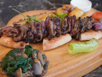 Marinated grilled meat skewers served with roasted baby potatoes, sautéed spinach, mushrooms, grilled tomatoes and peppers, finished with harissa sauce.