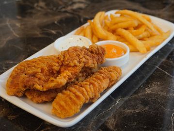 Crispy fried chicken tenders served, with French fries and house dipping sauce.