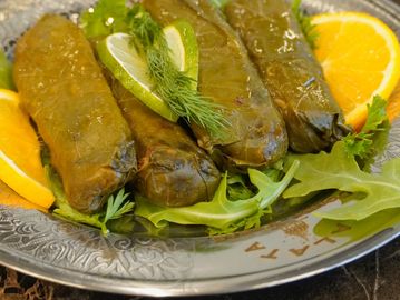 Tender grape leaves filled with rice, tomatoes, and fresh parsley.