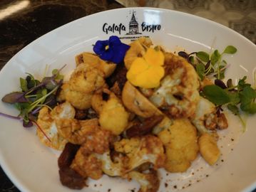 Crispy fried cauliflower served with a rich Turkish dried fig and tahini sauce, topped with fresh sorrel.