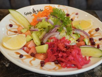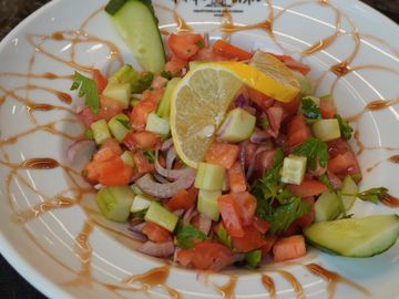 Chopped tomatoes, cucumber, onions, green peppers, and fresh parsley.Tossed with pomegranate molasses and extra virgin olive oil.