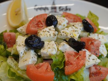 Crisp romaine lettuce, tomatoes, cucumber, red onions, green peppers, Kalamata olives, and feta cheese. Tossed with oregano, lemon juice, and extra virgin olive oil.