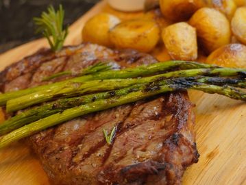 Juicy, flame-grilled ribeye with roasted vegetables and bold harissa sauce.