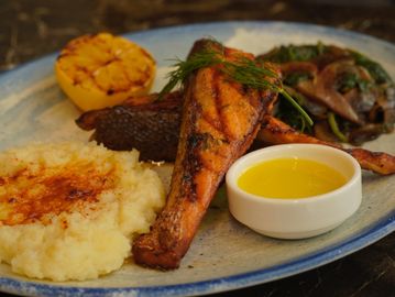 Served with roasted baby potatoes, sautéed spinach, mushrooms, grilled tomatoes and peppers. Finished with smoky harissa sauce.