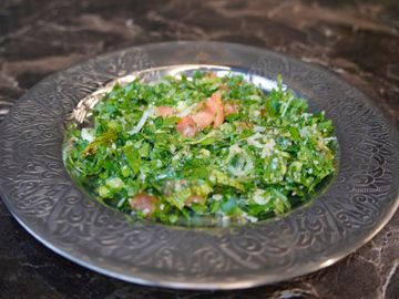 Finely chopped parsley, onions and scallions mixed with bulgur, dressed in lemon juice and olive oil.