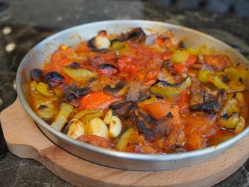 Eggplant cubes sautéed with fresh tomatoes, green and red bell peppers, onions, and garlic in a moderately spicy tomato sauce