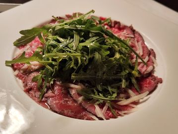 Thinly sliced smoked beef topped with Parmesan, arugula, and drizzled with balsamic vinegar and virgin olive oil.